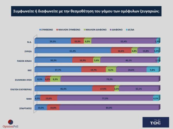 - Το 46.7% τάσσεται υπέρ του γάμου ομοφύλων έναντι ενός 50.4% που διαφωνεί. Η άποψη αυτή είναι πλειοψηφική στους ψηφοφόρους του ΣΥΡΙΖΑ , του Κ.Κ.Ε και της ΠΛΕΥΣΗΣ ΕΛΕΥΘΕΡΙΑΣ.