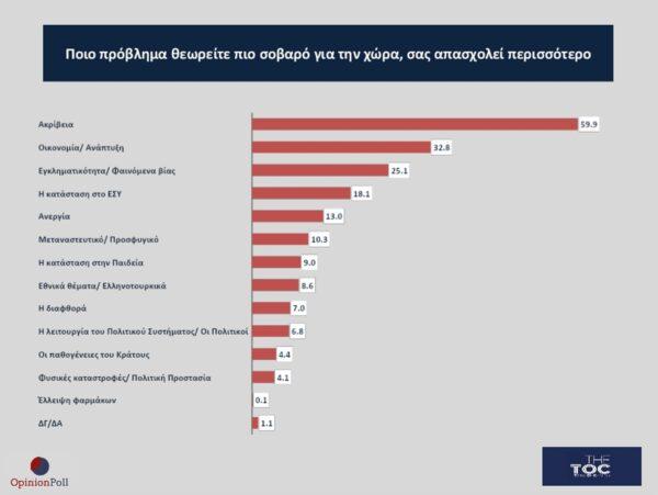 - Κυριαρχεί με σημαντικά ποσοστά μια τετράδα προβλημάτων που απασχολούν την κοινωνία με την ακρίβεια να φτάνει το 69.9% και να ακολουθούν θέματα οικονομίας και ανάπτυξης με 32.8% , η εγκληματικότητα/ παραβατικότητα με 25.1% και τα προβλήματα στο ΕΣΥ με 18.1%.