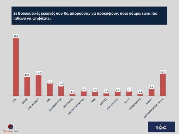 Στην πρόθεση ψήφου τα αποτελέσματα είναι: Ν.Δ 32.5%, ΠΑΣΟΚ 11.9%, ΣΥΡΙΖΑ 10.9%, Κ.Κ.Ε 7.2%, ΕΛΛΗΝΙΚΗ ΛΥΣΗ 5.6%, ΠΛΕΥΣΗ ΕΛΕΥΘΕΡΙΑΣ 2.8%, ΝΕΑ ΑΡΙΣΤΕΡΑ 2.6%, ΝΙΚΗ 2.5%, ΣΠΑΡΤΙΑΤΕΣ 1.5%, ΑΛΛΟ ΚΟΜΜΑ 2.7% Λευκό/ Άκυρο 1.4%, αποχή 4.1%, ενώ οι αναποφάσιστοι είναι 12.7%.