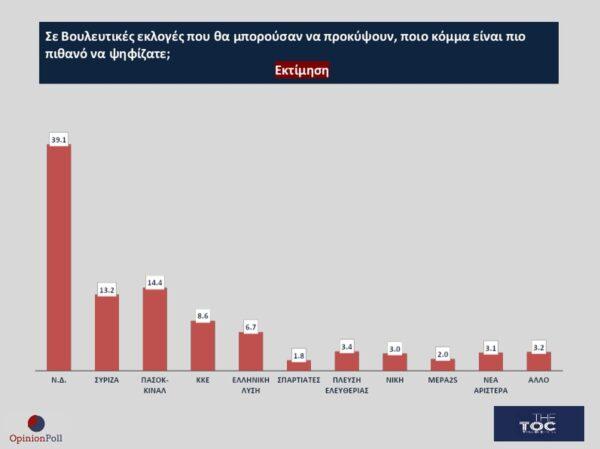 Στην εκτίμηση ψήφου η ΝΔ συγκεντρώνει το 39.1% και προγείται με διαφορά 24.7% του δεύτερου ΠΑΣΟΚ που συγκεντρώνει 14.4% και διαφορά άνω των 25 μονάδων από το τρίτο κόμμα που είναι ο ΣΥΡΙΖΑ που συγκεντρώνει 13.2%. Ακολουθούν Κ.Κ.Ε 8.6%, ΕΛΛΗΝΙΚΗ ΛΥΣΗ 6.7%, ΠΛΕΥΣΗ ΕΛΕΥΘΕΡΙΑΣ 3.4%, ΝΕΑ ΑΡΙΣΤΕΡΑ 3.1% (που δείχνει να σπάει οριακά το φράγμα του 3%) , ΝΙΚΗ 3%, ΜΕΡΑ 25 ποσοστό 2%, ΣΠΑΡΤΙΑΤΕΣ 1.8%, ΑΛΛΟ ΚΟΜΜΑ 3.2%.