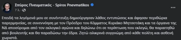 Σε ανάρτησή του στο Facebook την Παρασκευή, ο Σπύρος Πνευματικός απολογήθηκε εκ νέου για τη δήλωσή του και έκανε γνωστή την παραίτησή του.
