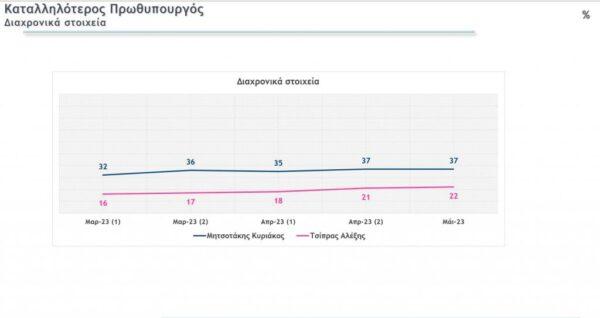 Καταλληλότερος για πρωθυπουργός εμφανίζεται ο Κ. Μητσοτάκης με 37% και ο Αλέξης Τσίπρας με 22%, ενώ ως καταλληλότερος πολιτικός αρχηγός για να εγγυηθεί την καλή λειτουργία των δημοκρατικών θεσμών είναι ο Κ. Μητσοτάκης με 32% και ακολουθεί ο Αλέξης Τσίπρας με 21%.