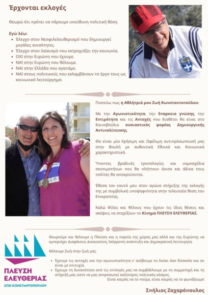 «Πάντα γελαστή και γελασμένη από ανθρώπους, αλλά με την ανακούφιση που φέρνει το αίσθημα του δικαίου, αποχωρώ από την #Πλεύση_Ελευθερίας και αποσύρω τη στήριξή μου στη Ζωή Κωνσταντοπούλου – Zoe Konstantopoulou.Έδωσα μία σιωπηλή εκλογική μάχη, έτσι όπως την επέλεξα, με 4.032 ανθρώπους να με ψηφίζουν για τα ιδανικά και τις αξίες μου. Από πρώτη στον Β1 τομέα όμως, με συνοπτικές μη δημοκρατικές διαδικασίες και εκκαθαρίσεις, βρέθηκα σήμερα να είμαι στην 9η θέση στις νέες λίστες του κόμματος.