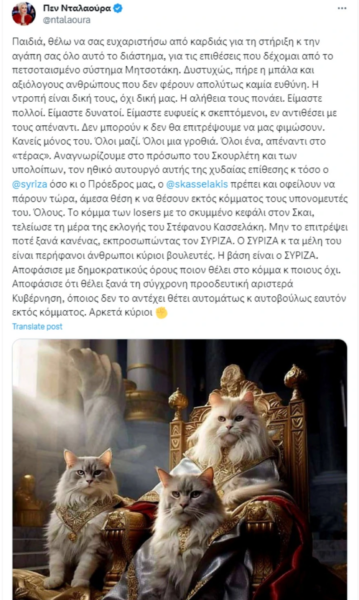 Είχε προηγηθεί αργά το βράδυ της Τετάρτης, λίγο πριν τα μεσάνυχτα και περίπου τρεις ώρες αφότου το protothema.gr είχε δημοσιεύσει το κείμενο με τίτλο «Ο Thanos Liontos αυτοαναγνωρίστηκε και δηλώνει «δεν είμαι εγώ η Πεν Νταλαούρα» – Δείτε το Τwitter του» ανάρτηση από τον εν λόγω troll λογαριασμό του ΣΥΡΙΖΑ ενός μακροσκελούς κειμένου στο οποίο στοχοποιούσε τον Πάνο Σκουρλέτη και ευχαριστούσε όσους τον έχουν υποστηρίξει.