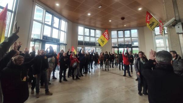 «Δεν αφήνουμε τίποτα να χαθεί, τα παίρνουμε πίσω όλα», και «ενισχύουμε την απεργία, μπλοκάρουμε την οικονομία», ήταν μερικά από τα συνθήματα που ακούστηκαν στον σταθμό Μον Παρνάς.