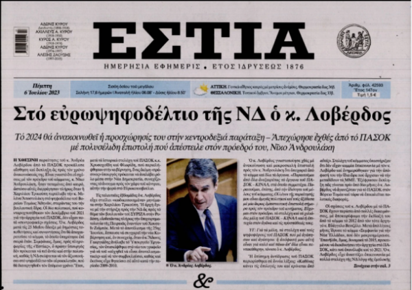 Όπως αναφέρει το πρωτοσέλιδο της ΕΣΤΙΑΣ ο πρώην βουλευτής του ΠΑΣΟΚ – ΚΙΝΑΛ έχει ήδη συμφωνήσει με τον Κυριάκο Μητσοτάκη και θα είναι στο ψηφοδέλτιο της ΝΔ για τις ευρωεκλογές.