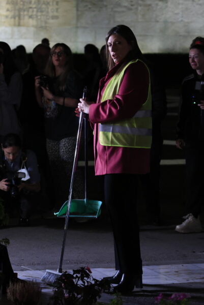 Η πρόεδρος της «Πλεύσης Ελευθερίας» φόρεσε ένα κίτρινο γιλέκο, πήρε σκούπα και φαράσι και συνέβαλε ενεργά στον καθαρισμό του χώρου, μαζί με τον Πάνο Ρούτσι.