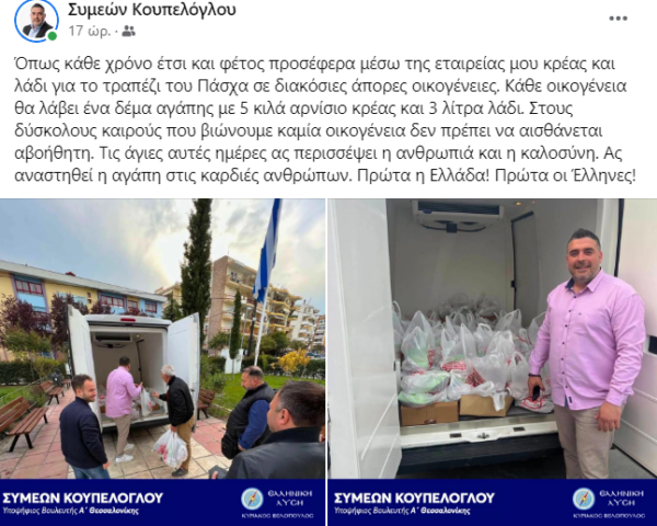 Διακόσιες οικογένειες θα απολαύσουν το πασχαλινό τους τραπέζι χάρη στην ευγενική προσφορά του υποψήφιου βουλευτή της Ελληνικής Λύσης στην Α’ εκλογική περιφέρεια Θεσσαλονίκης, Συμεών Κουπελόγλου. Συγκεκριμένα ο κ. Κουπελόγλου πρόσφερε σε διακόσιες οικογένειες από ένα δέμα αγάπης. Κάθε δέμα περιελάμβανε 5 κιλά κρέας και 3 λίτρα λάδι.