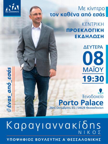 Τη Δευτέρα στις 8 Μαΐου αναμένεται να πραγματοποιηθεί η κεντρική προεκλογική εκδήλωση του δικηγόρου και υποψήφιου βουλευτή Α’ Θεσσαλονίκης της Νέας Δημοκρατίας Νίκου Καραγιαννακίδη στο Porto Palace στις 19:30.