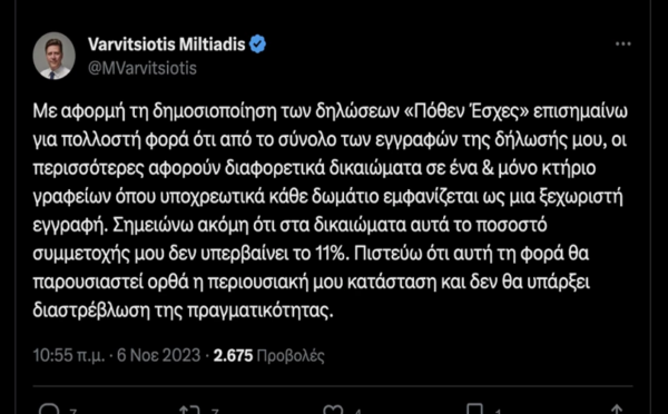 «Οι περισσότερες εγγραφές αφορούν διαφορετικά δικαιώματα σε ένα και μόνο κτήριο γραφείων με πολλά δωμάτια» αναφέρει με ανάρτησή του στο X ο Μιλτιάδης Βαρβιτσιώτης.