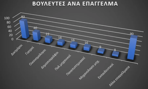 Συνεπώς δικηγόροι, γιατροί όλων των ειδικοτήτων μηχανικοί, οικονομολόγοι, δημοσιογράφοι και πανεπιστημιακοί, αποτελούν τις μεγαλύτερες επαγγελματικές ομάδες στα έδρανα της τρέχουσας Βουλής των Ελλήνων, επισημαίνει το περιοδικό.