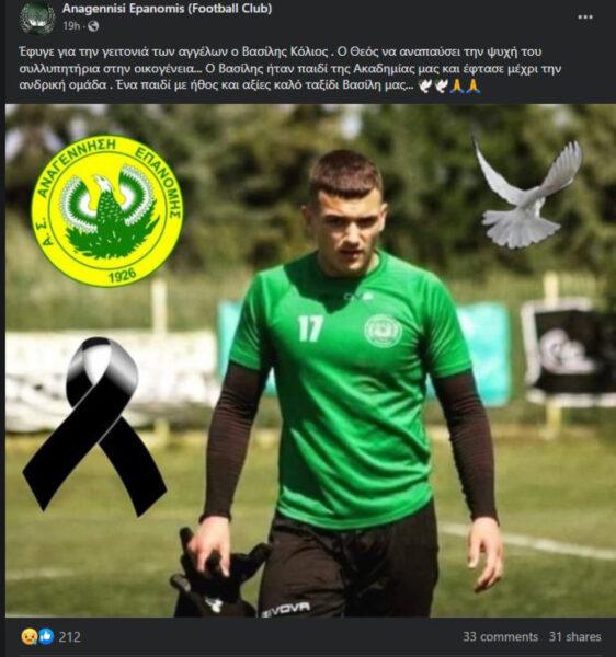 Σε ανάρτησή της στο Facebook, η Αναγέννηση Επανομής αποχαιρέτισε τον αδικοχαμένο Βασίλη Κόλιο επιβεβαιώνοντας την τραγική είδηση: