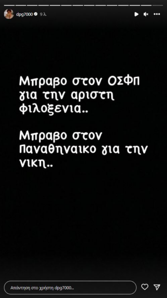 «Μπράβο στον Ολυμπιακό για την άριστη φιλοξενία… Μπράβο στον Παναθηναϊκό για την νίκη», ανέφερε ο Δημήτρης Γιαννακόπουλος μέσω ανάρτησης στα social media.