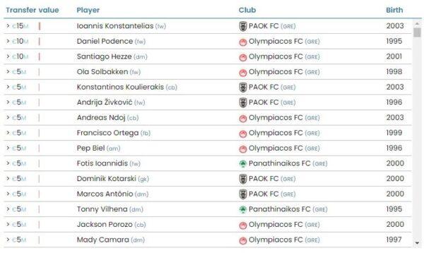 Ο Γιάννης Κωνσταντέλιας βρίσκεται σε αυτήν τη λίστα και εκτιμάται ότι η τιμή του ανέρχεται σε 15,4 εκατομμύρια ευρώ και πάνω. Αυτό σημαίνει ότι για να τον αποκτήσει κάποια ομάδα από τον ΠΑΟΚ, θα πρέπει να προσφέρει αυτό το ποσό ή περισσότερα. Επίσης, ο Γιάννης Κωνσταντέλιας ξεπερνά τον Φλάβιο Κονσεϊσάο, γιο του Σέρτζιο Κονσεϊσάο, που αγωνίζεται στην Πόρτο.