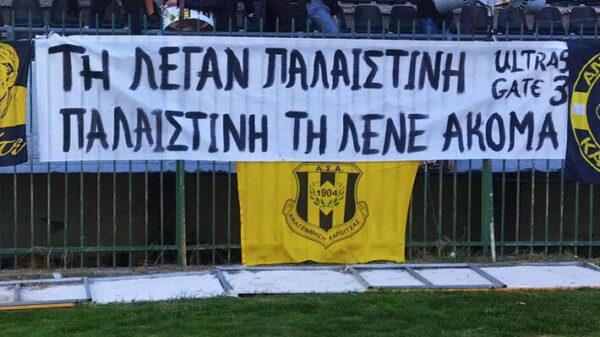 Πανό υπέρ της Παλαιστίνης και του λαού της ανάρτησαν οι οπαδοί της Αναγέννησης Καρδίτσας, παίρνοντας ξεκάθαρη θέση καταδίκης του ισραηλινού κράτους.
