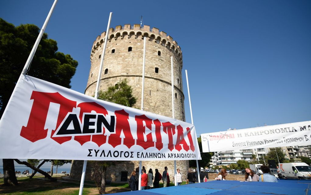 Συγκέντρωση διαμαρτυρίας στον Λευκό Πύργο πραγματοποίησαν νωρίτερα σήμερα οι εργαζόμενοι στο υπουργείο Πολιτισμού και Αθλητισμού (ΥΠΠΟΑ) στη Βόρεια Ελλάδα, κρατώντας πανό με το σύνθημα «δεν πωλείται».