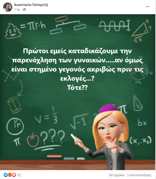Η υποψήφια βουλευτής στη Β΄ Θεσσαλονίκης, Αναστασία Γαϊταρτζή, γράφει σε ανάρτησή της στο Facebook: «Πρώτοι εμείς καταδικάζουμε την παρενόχληση των γυναικών….. αν όμως είναι στημένο γεγονός ακριβώς πριν τις εκλογές…; Τότε;;».