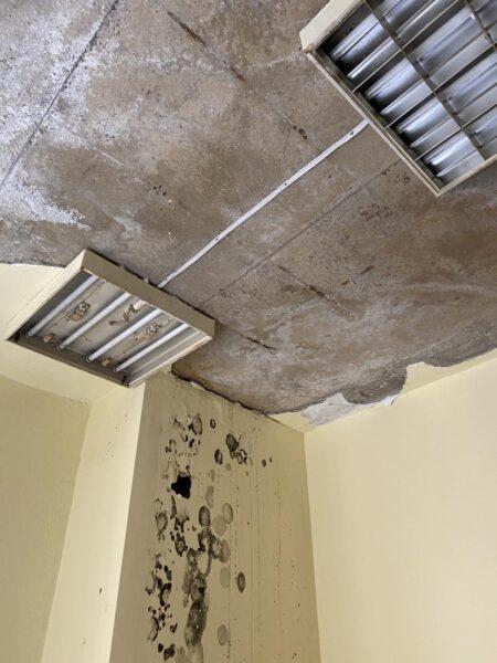 Μέσα στον χώρο αυτόν υπάρχουν εργαζόμενοι με αναπνευστικά προβλήματα, λειτουργούν επί ώρες άνθρωποι που έχουν δικαίωμα σε καλές συνθήκες υγιεινής και ασφάλειας. Στην μουχλιασμένη οροφή διαπερνούν και οι καλωδιώσεις ηλεκτρικών εγκαταστάσεων και η πιθανότητα βραχυκυκλώματος είναι ορατή, με ό,τι αυτό μπορεί να σημαίνει ενόψει εκλογών.
