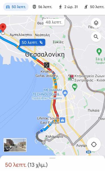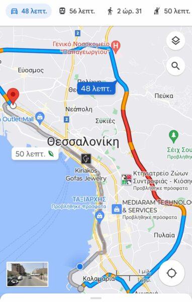 Ένα ακόμη παράδειγμα, είναι πως οι οδηγοί που μετακινούνται αυτήν την ώρα από Καλαμαριά (ανατολικά) προς Αμπελόκηπους (δυτικά) θα περάσουν 48 λεπτά στα οχήματά τους μέσω Περιφερειακού και 50 λεπτά μέσω Τσιμισκής.