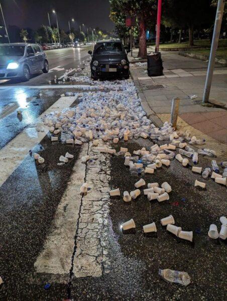 Χιλιάδες πλαστικά μπουκάλια και ποτήρια πλημμύρισαν όλους τους δρόμους του κέντρου της Θεσσαλονίκης καθώς όπως η κατάσταση που διαμορφώθηκε καταδεικνύει, δήμος και διοργανωτές δεν είχαν μεριμνήσει για την άμεση αποκομιδή των σκουπιδιών.