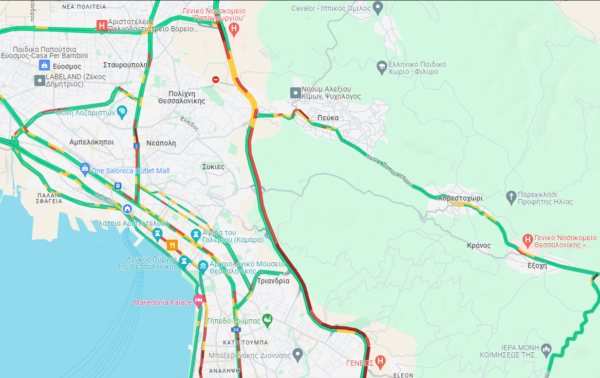 Όπως θα δει κανείς στους χάρτες της google, από το νοσοκομείο Παπαγεωργίου με κατεύθυνση προς ανατολικά, υπάρχουν αρκετά σημεία τα οποία είναι μπορντό ή κοκκινισμένα, πράγμα που σημαίνει ότι υπάρχει μεγάλο κυκλοφοριακό κομφούζιο στην περιοχή, με τα αυτοκίνητα να μη μπορούν να ξεπεράσουν τα 50 χιλιόμετρα την ώρα.