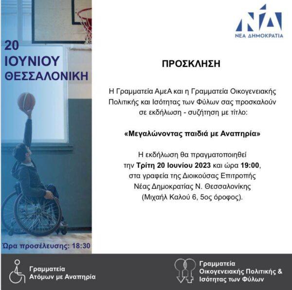 Εκδήλωση με θέμα «μεγαλώνοντας παιδιά με Αναπηρία» διοργανώνει η Γραμματεία ΑμεΑ και η Γραμματεία οικογενειακής πολιτικής και ισότητας των φύλων της ΝΔ, την Τρίτη στη Θεσσαλονίκη.