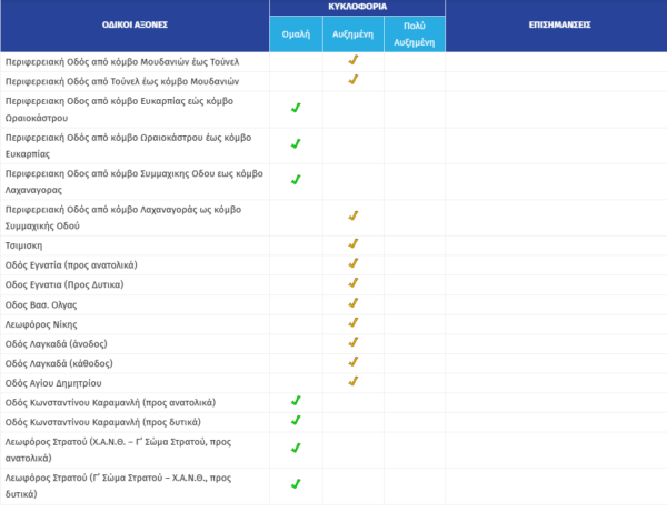 Μέσα στην πόλη, μποτιλιάρισμα αντιμετωπίζουν οι οδηγοί σε βασικούς οδικούς άξονες, όπως οι Κωνσταντίνου Καραμανλή, Βασιλίσσης Όλγας, Τσιμισκή, Μίκη Θεοδωράκη (πρώην Λαγκαδά), Ελευθερίου Βενιζέλου (Νεάπολη), Εθνικής Αμύνης, 3ης Σεπτεμβρίου, Λαμπράκη, Παπάφη, Παπαναστασίου, Δελφών, Λεωφόρο Στρατού και Μάρκου Μπότσαρη.