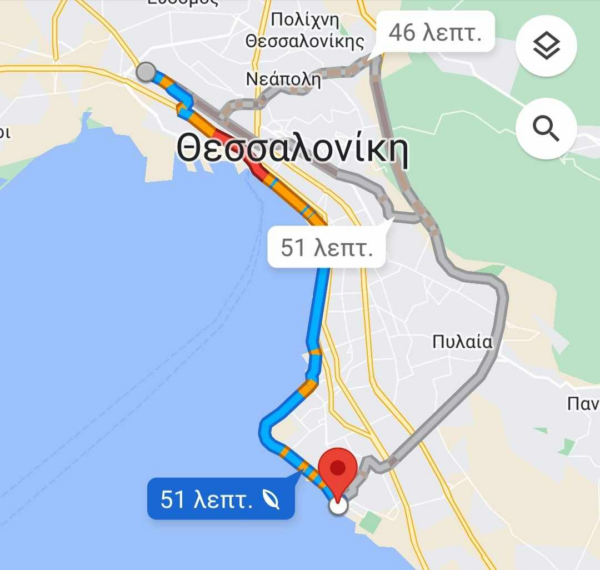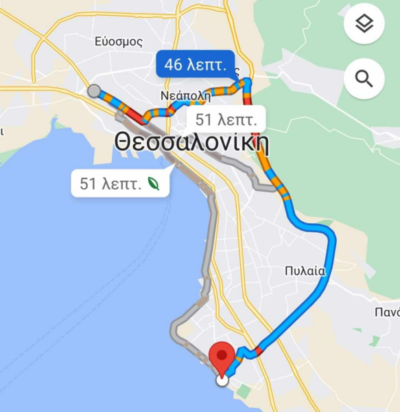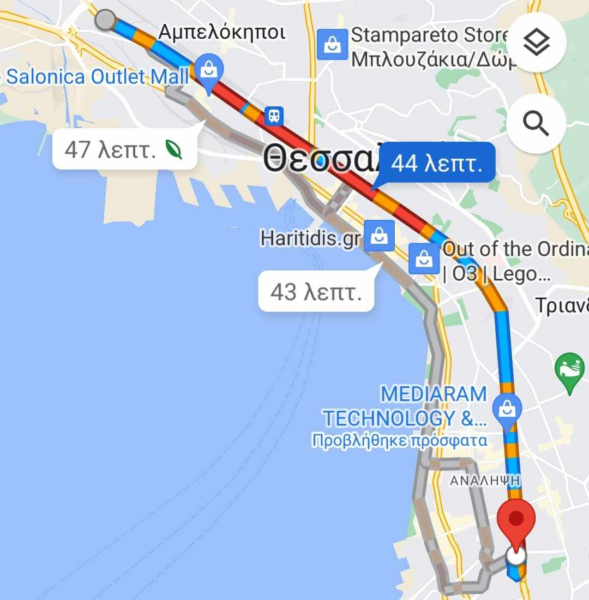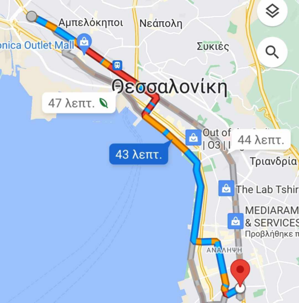 Χαρακτηριστικό παράδειγμα της κίνησης είναι το γεγονός ότι από τη δυτική Θεσσαλονίκη μέχρι την περιοχή της Βούλγαρη το κέντρο είναι «κόκκινο» με τον οδηγό να χρειάζεται το λιγότερο 43′ ενώ για την Καλαμαριά από το κέντρο θα χρειαστεί 51′ και από τον περιφερειακό 46′.