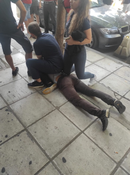 Οι πολίτες αφού κατάλαβαν ότι επρόκειτο για ληστή, τον ακινητοποίησαν πριν μπει στο μαγαζί και ενημέρωσαν την Αστυνομία η οποία τον συνέλαβε άμεσα.