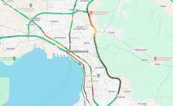 Συγκεκριμένα όλη η πόλη βρίσκεται στα κόκκινα, με τον περιφερειακό να έχει μπλοκαριστεί από την Πυλαία μέχρι και το Παπαγεωργίου.