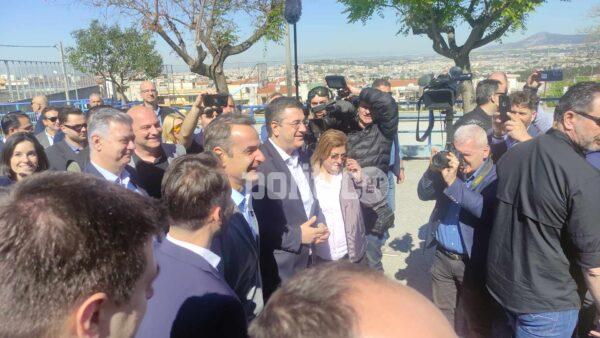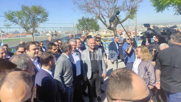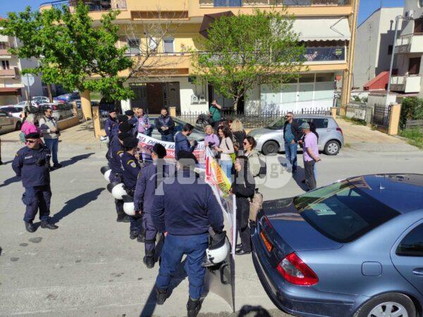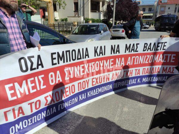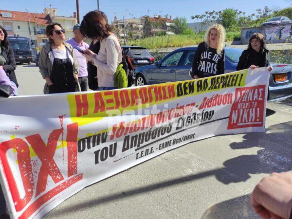 Έξω από το 3ο Γυμνάσιο Πολίχνης συγκεντρώθηκαν εκπαιδευτικοί και μέλη συλλογών γονέων και κηδεμόνων, ώστε να διαμαρτυρηθούν για την άφιξη του Κυριάκου Μητσοτάκη.