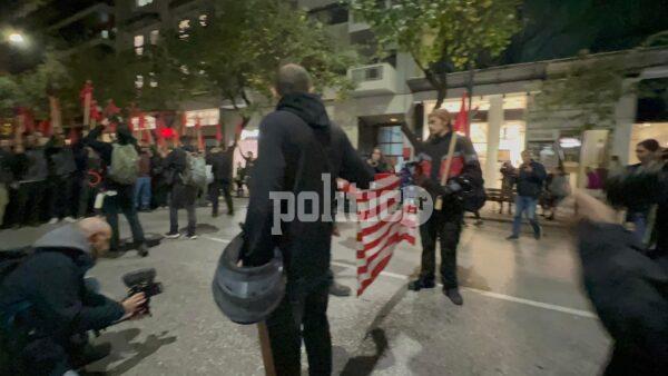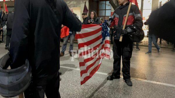 Υψώνοντας τις κόκκινες σημαίες τους στον αέρα και τραγουδώντας το «ποτε θα κάνει ξαστεριά», φοιτητές έκαψαν την σημαία των ΗΠΑ έξω από την αμερικανική πρεσβεία.