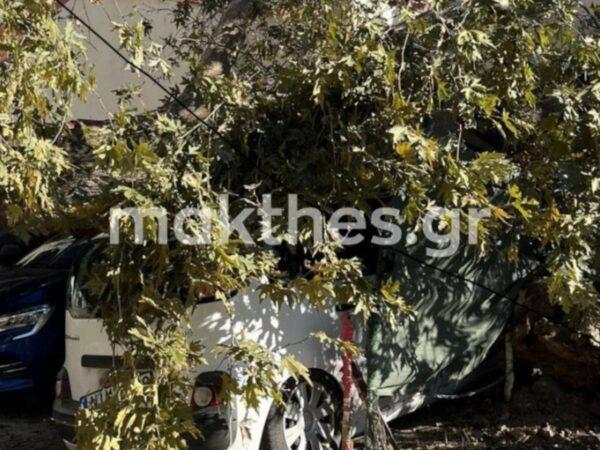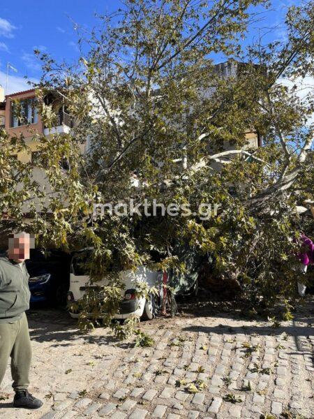 Το δέντρο έπεσε σε στέγαστρο και καταπλάκωσε δυο σταθμευμένα οχήματα, με το ένα μάλιστα να έχει σχεδόν καταστραφεί.
