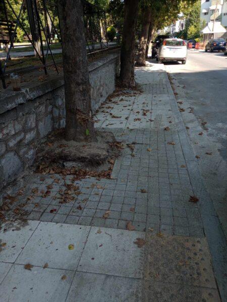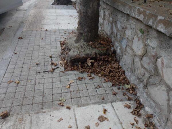-Είναι άδικο οι ρίζες από τα δέντρα να σπάνε συνεχώς τις πλάκες πεζοδρομίου με αποτέλεσμα αυτές να ξεκολλούν και εσύ ως δημοτική αρχή να συνεχίζεις να τοποθετείς πλάκες -αυτή η καταπληκτική ελληνική πατέντα!- αντί να αναζητήσεις διαφορετικό υλικό επένδυσης, όπως γίνεται στις περισσότερες χώρες του εξωτερικού.