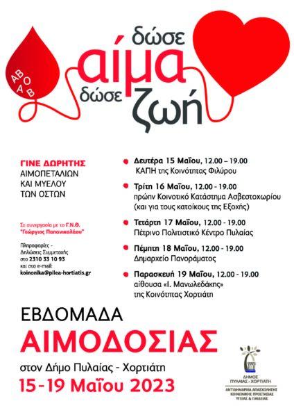 Εβδομάδα εθελοντικής αιμοδοσία από τις 15 έως τις 19 Μαΐου από τον δήμο Πυλαίας-Χορτιάτη σε όλες τις δημοτικές ενότητες.