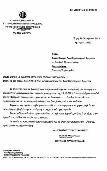 Στην επιστολή τους με την ένδειξη εξαιρετικά επείγον το ιατρικό προσωπικό του Νοσοκομείου “Παπανικολάου” ενημερώνει ότι επειδή οι εφημερίες του Οκτωβρίου δεν δύναται να καλυφθούν από τις 25/10/2023 από αύριο αναστέλλονται τα τακτικά πρωινά χειρουργεία όλων των κλινικών και εξυπηρετούνται μόνο τα έκτακτα και επείγοντα χειρουργεία.